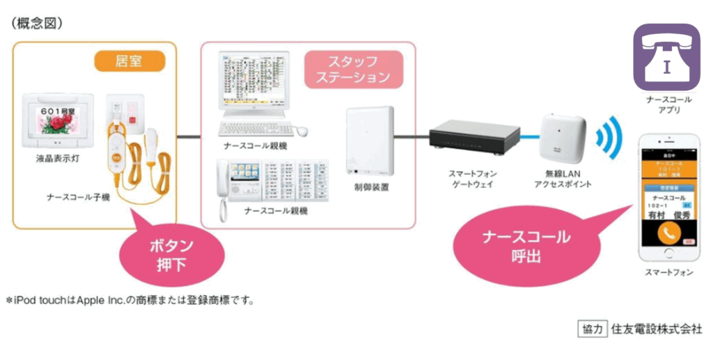 また、使用するスマートフォンの機種やOSの選定も導入時の重要なポイントです。動作検証済みの無線APと、iOSに対応したナースコール連携アプリ「SDPhoneシリーズ」を組み合わせることで、安定した運用を実現します。